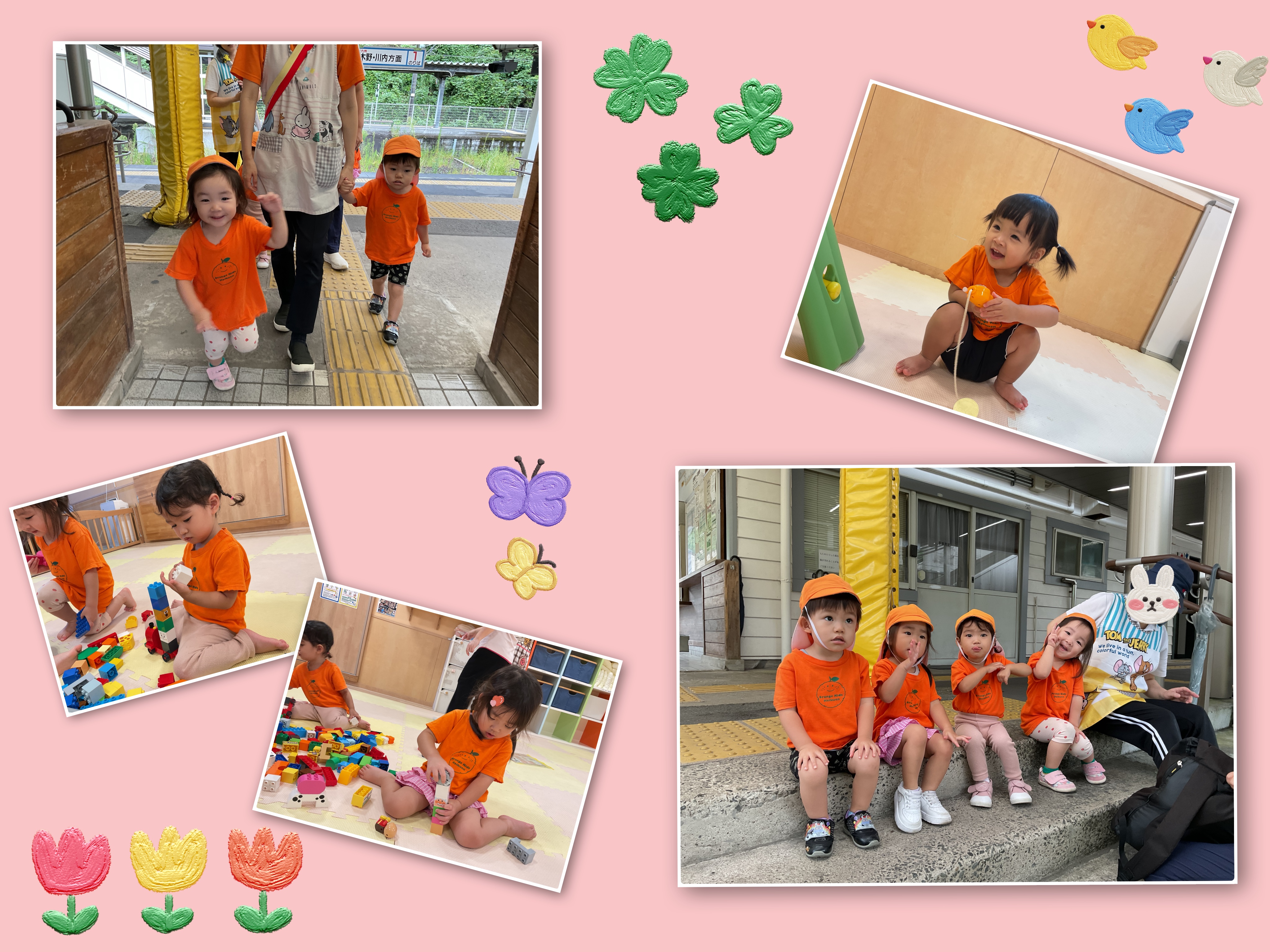 こんにちは😃オレンジキッズ保育園🍊です🍀今日は、近くの駅までお散歩に行きました🎶電車🚃が来るまで待ちきれず、保育園までUターンしちゃいました😊まだまだ暑いので水分補給をしながら、今日も元気いっぱいの子どもたちでした💕