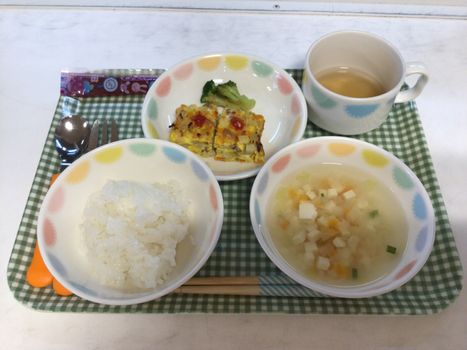 【本日の給食】・ごはん・ひき肉と切り干し大根のオムレツ・ブロッコリーのごま和え・角切り野菜スープ・スティックゼリー